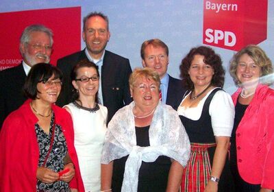 Die niederbayerische Delegation bei der 120-Jahr-Feier: Die Landtagsabgeordneten Johanna Werner-Muggendorfer und Reinhold Perlak, Anja König, Stadtverbandsvorsitzende Landshut, Peter Stranninger, stellv. Bezirksvorsitzender, MdB a. D. Bruni Irber (Ehrenvorsitzende der SPD Niederbayern), Christian Flisek, stellv. Bezirksvorsitzender, Ruth Müller, Kreis- und Fraktionsvorsitzende Landkreis Landshut und Rita Hagl, stellv. Bezirksvorsitzende.
