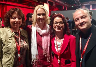 Mit einem neuen Gesetzentwurf zur kostenfreien Bildung von der Kita bis zur Uni, von der Meisterprüfung bis zur Erwachsenenbildung will Familienministerin Manuela Schwesig das sozialdemokratische Ziel der Chancengerechtigkeit und der Entlastung von Familien konsequent umsetzen. Die SPD-Landtagsabgeordnete Ruth Müller und die SPD-Bundestagskandidatin Anja König stellten sich hinter die Ziele der Ministerin. Das Bild zeigt Manuela Schwesig mit den beiden Sozialdemokratinnen und Harald Unfried, die als Delegierte die örtliche SPD auf dem Bundesparteitag vertreten, bei dem Martin Schulz mit einem 100-Prozent-Ergebnis zum SPD-Parteivorsitzenden gewählt und zum Kanzlerkandidaten nominiert wurde.