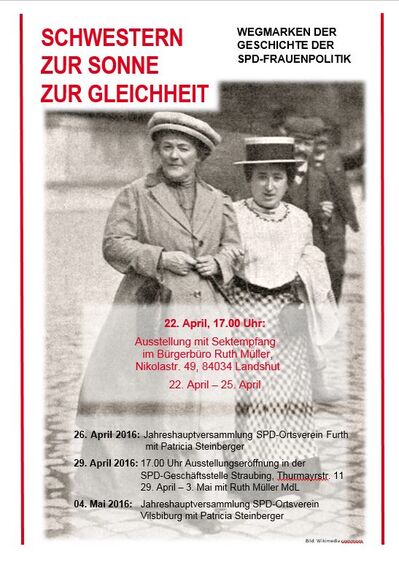 Der heute noch immer andauernde Weg politisch engagierter Frauen wird in der Ausstellung „Schwestern zur Sonne zur Gleichheit“ gezeigt. Dabei werden anhand von Biographien bekannter Sozialdemokratinnen von Clara Zetkin bis Renate Schmidt 150 Jahre Geschichte lebendig.