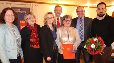 Bild: Ehre, wem Ehre gebührt: Ursula Egner (Dritte von rechts) wurde für ihre Verdienste mit der Willi-Brandt-Silbermedaille ausgezeichnet. MdL Ruth Müller (von links), Ortsvorsitzende Cornelia Czichon, MdL Natascha Kohnen, Jochaim Czichon, Bürgermeister-Stellvertreter Bernhard Pritscher und Ugur Sahin gratulierten.