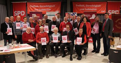 Rot war Trumpf: Der SPD-Arbeitskreis Labertal hat beim Festakt langjährigen Mitgliedern Dankesurkunden überreicht – darunter Heinz Weidke aus Geiselhöring (vorne, Zweiter von links) für 60 Jahre und Herta Neumeier aus Straubing (vorne, Mitte) für „fast 70 Jahre“. Es gratulierten unter anderem der SPD-Fraktionschef Markus Rinderspacher (vorne, Zweiter von rechts), Arbeitskreis-Sprecher Rainer Pasta (direkt dahinter), der SPD-Kreisvorsitzende Martin Kreutz (rechts hinter Pasta), die SPD-Vorsitzende des Nachbarlandkreises Landshut, MdL Ruth Müller (Dritte von rechts), und der Neufahrner Bürgermeister Peter Forstner (rechts).