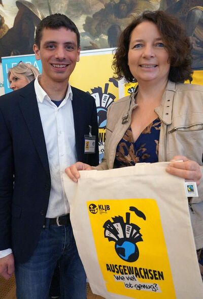 Bei einem Infostand im Bayerischen Landtag nutzte die KLJB die Gelegenheit, ihr neues Projekt „Ausgewachsen. Wieviel ist genug?“ den Abgeordneten vorzustellen. Der KLJB-Landesvorsitzende Andreas Deutinger überreichte der Pfeffenhausener Landtagsabgeordneten Ruth Müller, die selber viele Jahre in der KLJB aktiv war, eine Tasche mit dem Kampagne-Logo. Im Mittelpunkt des Projekts soll die Frage stehen, wie unser Planet, unsere Gesellschaft und jeder Einzelne mit dem Wachstum und seinen Folgen umgeht, so Deutinger. Noch über ein Jahr sollen dazu in den Diözesanverbänden Aktionen stattfinden, wie beispielsweise „Upcycling-Wettbewerbe“.