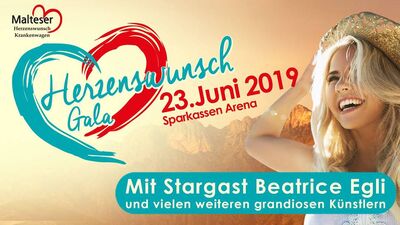 Am Sonntag, den 23. Juni steigt in der Sparkassen Arena ab 18.00 Uhr (Einlass um 17.00 Uhr) die große Herzenswunsch-Benefizgala der Malteser für den Herzenswunsch-Krankenwagen mit Stargast Beatrice Egli. Auch für Familien ist am Nachmittag ab 13.00 Uhr mit Kinderschminken, Hüpfburg und weiteren spannenden Aktionen viel geboten.