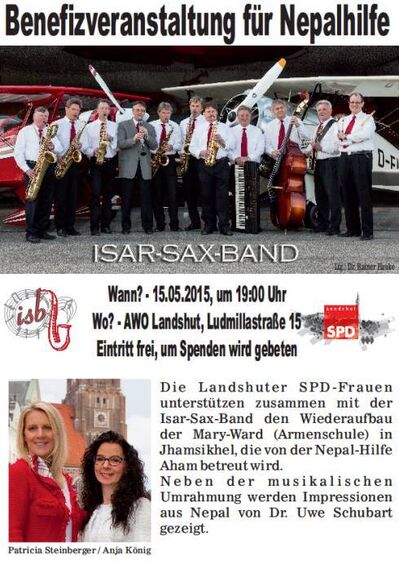 Bestürzt sind wir alle über die verheerenden Auswirkungen, die das Erdbeben in Nepal auslöste. Die Frauen im SPD-Stadtverband Landshut veranstalten zusammen mit der Isar-Sax-Band eine Benefizveranstaltung.