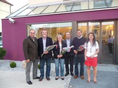 Die beiden ehemaligen Stadträte Dr. Wolf Rösel (2.v.r.) und Walter Zieglmeier (r.), die ebenfalls eine langjährige Zusammenarbeit im Stadtrat mit Steinberger verbindet, schlossen sich den Glückwünschen an, wie auch der Direktkandidat für den Bundestag Harald Unfried (4.v.l.).
