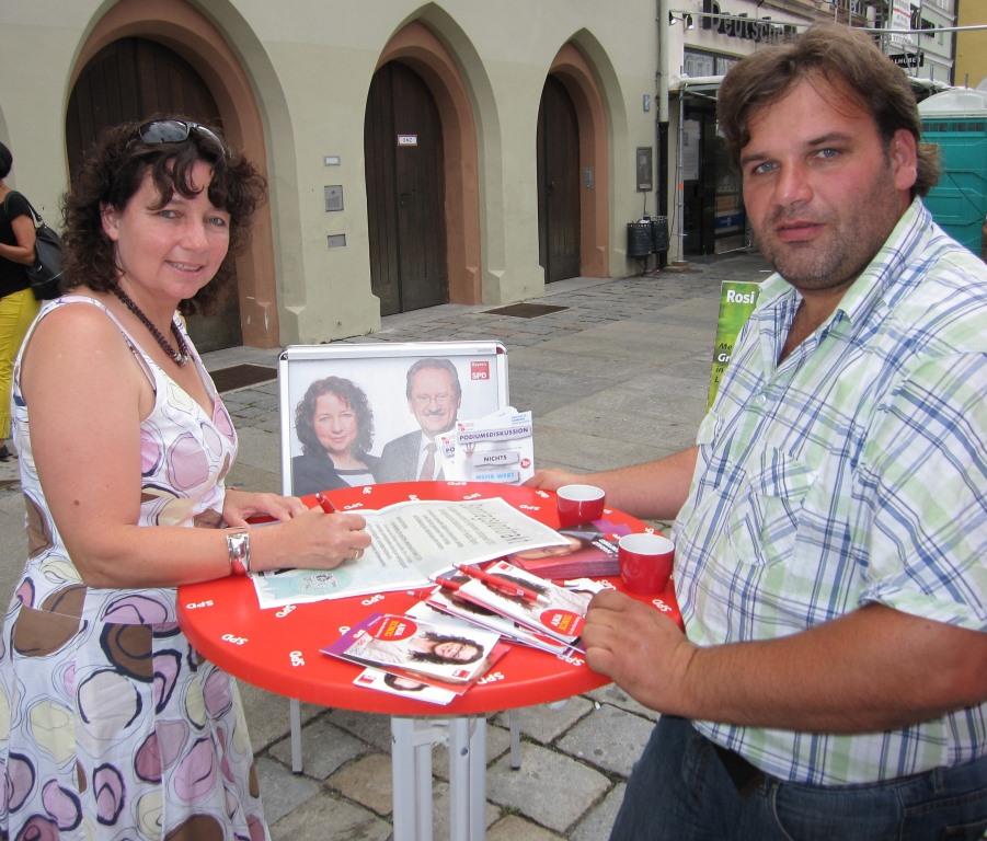 Der SPD-Kandidatin für den Landtag statte Diözesan-Sekretär der KAB, Rainer Forster einen Besuch am Landshuter Infostand ab. Mit im Gepäck hatte er einen "Sonntagskontrakt", den es zu unterschreiben galt. Im Mittelpunkt steht der Erhalt des gemeinsamen freien Sonntags und die Bewahrung des Ladenschlusses.