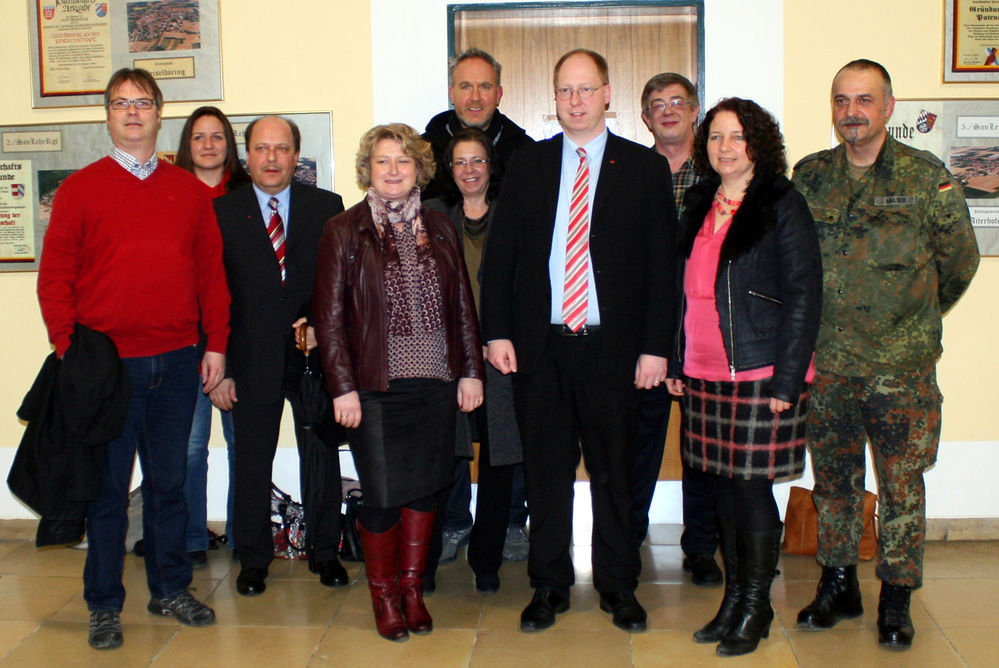Bildunterschrift: Informierten sich über das Sanitätslehrregiment „Niederbayern“: die beiden Bundestagsabgeordneten Rita Hagl-Kehl und Matthias Ilgen (vorne Mitte), Ruth Müller, MdL, sowie Vertreter der SPD in Stadt und Landkreis mit ihrem Gastgeber, dem stellvertretender Kommandeur, Oberstleutnant Andreas Walter (re).