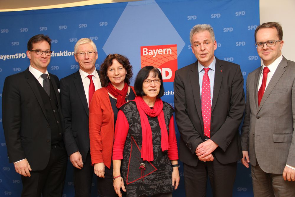Foto v. l. n. r.: Florian Pronold, MdB; Landtagsabgeordnete Bernhard Roos, Johanna Werner Muggendorfer und Ruth Müller, Matthias Jena (DGB Bayern) und Markus Rinderspacher, MdL (Fraktionsvorsitzender SPD)