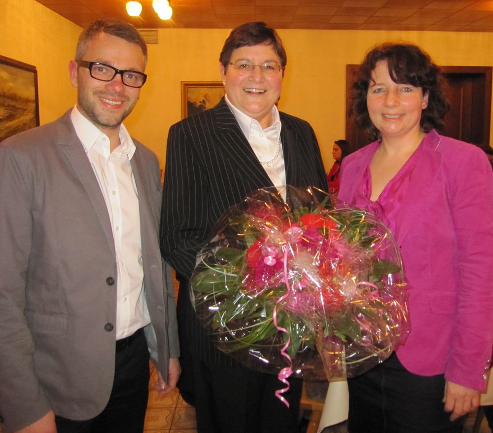 Foto: Landratskandidatin Christel Engelhard (Mitte mit Blumen) gemeinsam mit stv. Kreisvorsitzenden Josef Kollmannsberger ((li.) und MdL Ruth Müller (re.)