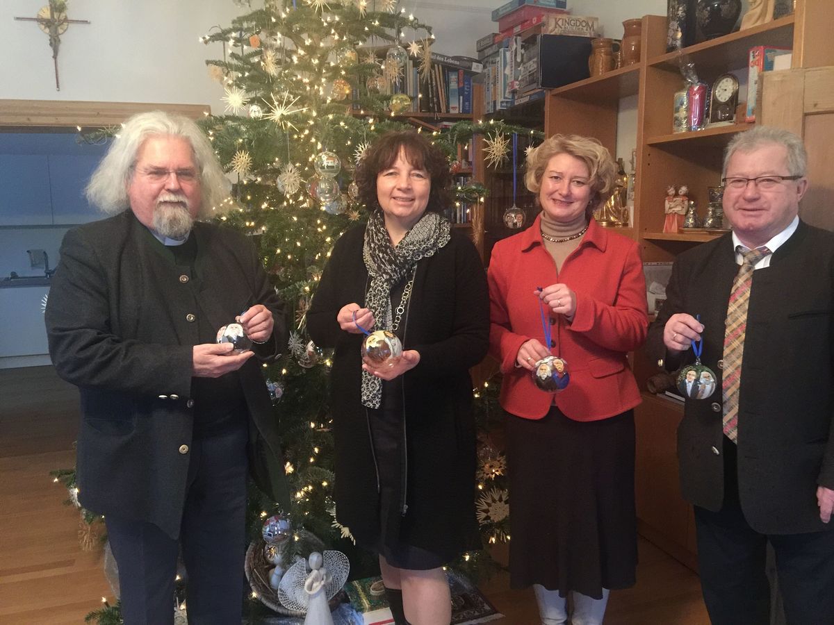 Im frisch renovierten Pfarrhaus reicht der Christbaum bis unter die Decke und weist einen ganz besonderen Schmuck auf: Handbemalte Christbaumkugeln, die die Begegnungen von Stadtpfarrer König wiederspiegeln. Seit vielen Jahren malt ihm eine Bekannte Porträts seiner Besucher und Besucherinnen auf Glaskugeln und hält so die Erinnerungen für die Weihnachtszeit fest. So hängen dort Kugeln mit den Bildern von Stadtpfarrer König in der Kutsche beim Auszug zum Gäubodenvolksfest genauso wie Porträts von Landrat Dreier, Papst Benedikt, Uli Hoeneß oder der Festwirtin vom Vilsbiburger Volksfest. Und Stadtpfarrer König hat es sich zur Tradition gemacht, die „Kugel-Darsteller“ einzuladen, ihre eigene Kugel an den Christbaum zu hängen. Ruth Müller, MdL und Hans Sarcher waren im vergangenen Jahr wegen der Finanzierung der Pfarrhof-Sanierung bei ihm zu Gast und die Bilder dieses Besuchs fanden sich nun auf den Christbaumkugeln wieder, die die beiden an einen Tannenzweig hängten. Auch in den nächsten Jahren stehen wieder Sanierungsaufgaben auf der Agenda der Pfarrei, berichtete König den Besuchern und verwies auf die notwendige Sanierung der Kirche St. Nikolaus in Herrnfelden und bat um Unterstützung bei einem Zuschuss durch die Landesstiftung. Die Abgeordnete Ruth Müller überreichte dafür auch eine Spende an Stadtpfarrer König.