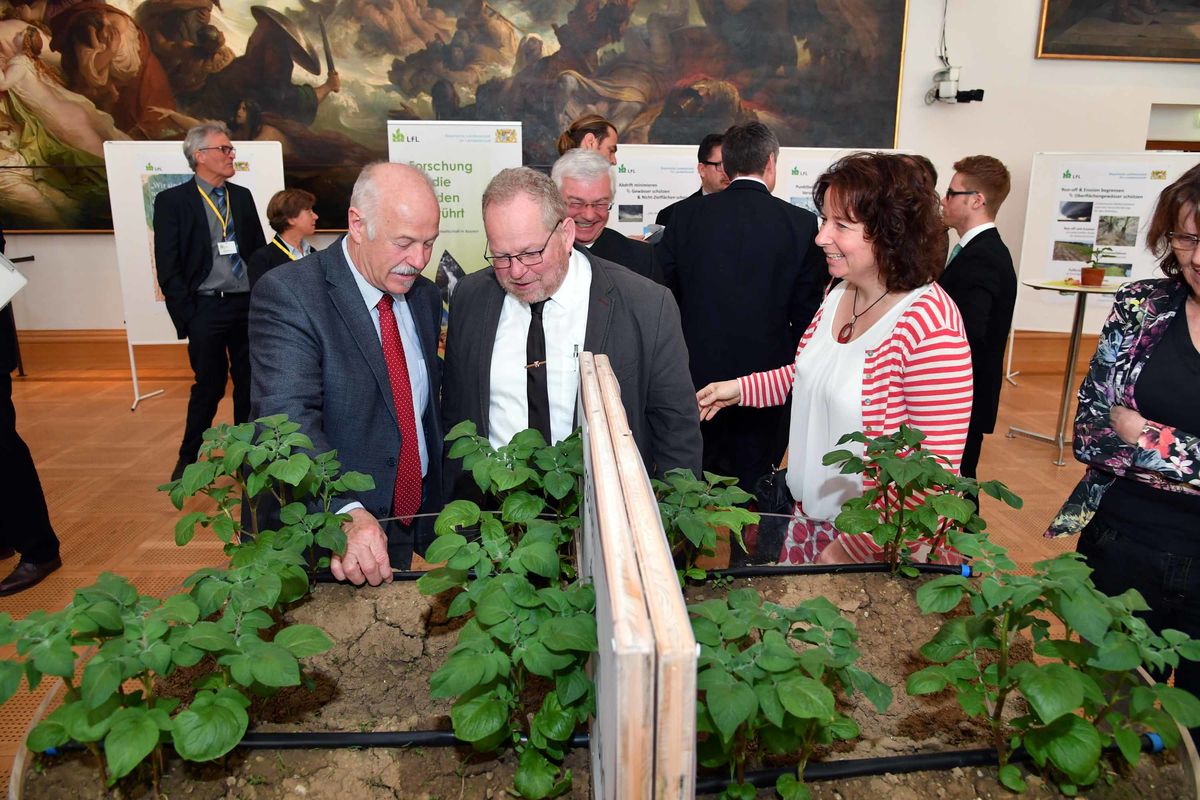Bildunterschrift: Die Abgeordneten Ruth Müller (re.) und Klaus Adelt (Mitte) lassen sich von einem Mittarbeiter des LfL ressourcenschonende Bewässerungsanlagen erklären