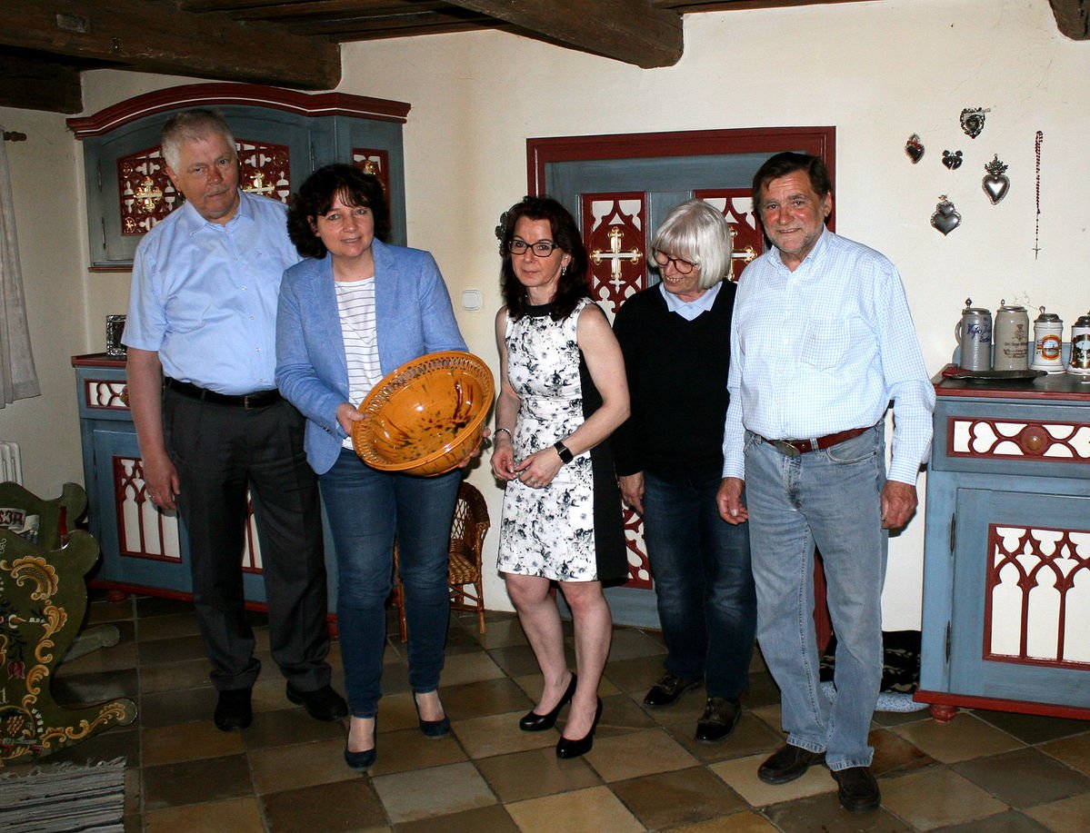 Bewunderten in der „Guten Stube“ des Steinberger-Anwesens auch Kröninger Keramik: Die Landtagsabgeordneten Ruth Müller (2.v.li.) und Reinhold Strobl (li.) sowie SPD-Landesvorstandsmitglied Anja König (Mitte) mit dem Ehepaar Elfriede (2.v.re.) und Gerd Steinberger (re.)